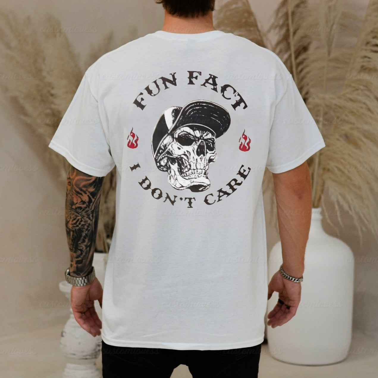 Make your attitude loud and clear with this bold statement tee featuring a grinning skull and the words: “Fun Fact: I Don’t Care.” Perfect for those who live unapologetically and don’t take life (or others’ opinions) too seriously.